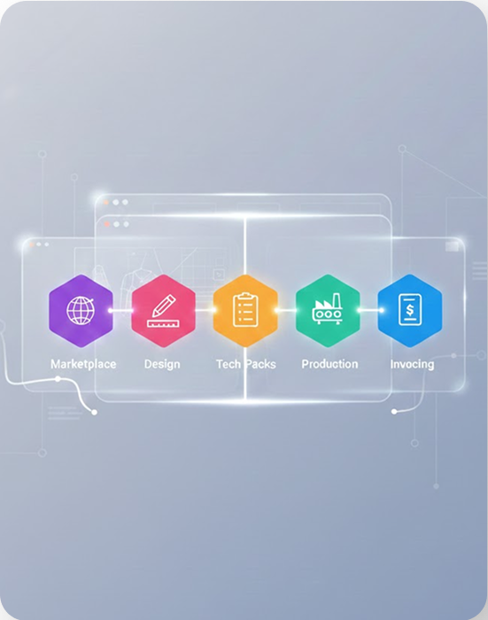 Marketplace + Design + Tech Packs + Production + Invoicing. One login. One source of truth.
